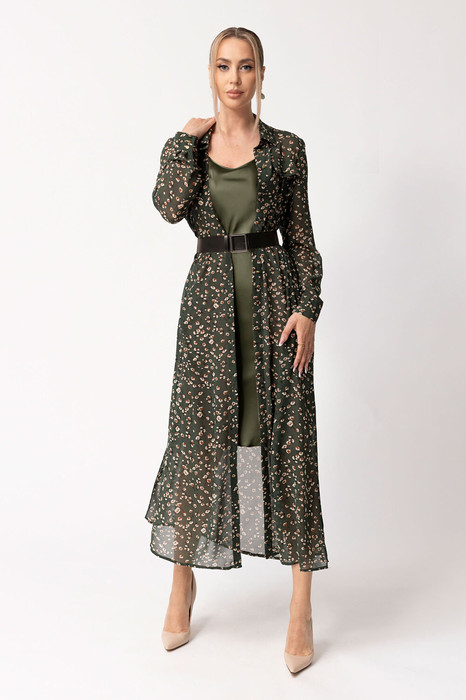 Платье с центральной застежкой на петли и пуговицы, втачным воротником с отрезной стойкой. По переду с клапанами. Спинка с отрезной кокеткой, переходящей на перед. Платье двойное. Нижнее платье на бретелях, с нагрудными вытачками по переду. Платье со съемным поясом.