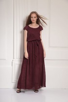 Платье с отрезной стойкой, застежкой на потайную молнию в среднем шве спинки, и на две навесные петли и пуговицы по стойке спинки. Платье отрезное по линии талии. Верхняя часть переда со средним швом, рельефами, выходящими из проймы. Нижняя часть переда и спинки состоит из четырех деталей. По окату и шву притачивания манжеты- сборка. Платье со съемным поясом.