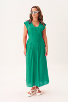 Платье без воротника, с квадратным вырезом горловины, застежкой на потайную молнию в среднем шве спинки. По переду с рельефами, выходящими из проймы. Спинка со средним швом, рельефами, выходящими из проймы. Рукав реглан, крылышко. Верхняя часть рукава присборена на резинку.