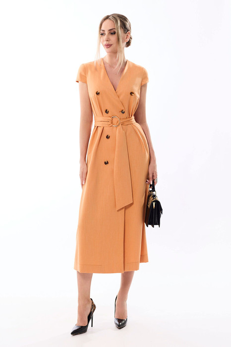Платье расширенное к низу, без воротника, с V-образным вырезом горловины, с центральной двубортной застежкой на петли и пуговицы. Перед с нагрудными вытачками. Спинка со средним швом. В боковых швах расположены карманы. Рукав втачной, крылышко. Платье со съемным поясом.