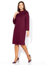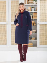 Свободное платье-свитер прямого покроя с разрезом по детали переда с левой стороны. Линия плеча спущенная с втачным рукавом прямого покроя стандартной длины. Вырез горловины округлый со свитерным воротником.