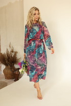 Платье женское свободного силуэта в стиле «боххо», вырез горловины округлый с декоративной трикотажной резинкой. Изделие без рукава со спущенной линией плеча и отделкой по низу. В боковых швах карманы и фигурные разрезы по низу. Декором является принт по полочке. По спинке – имитация планки с пуговицами. Платье без застежки. Длина платья 122 см.