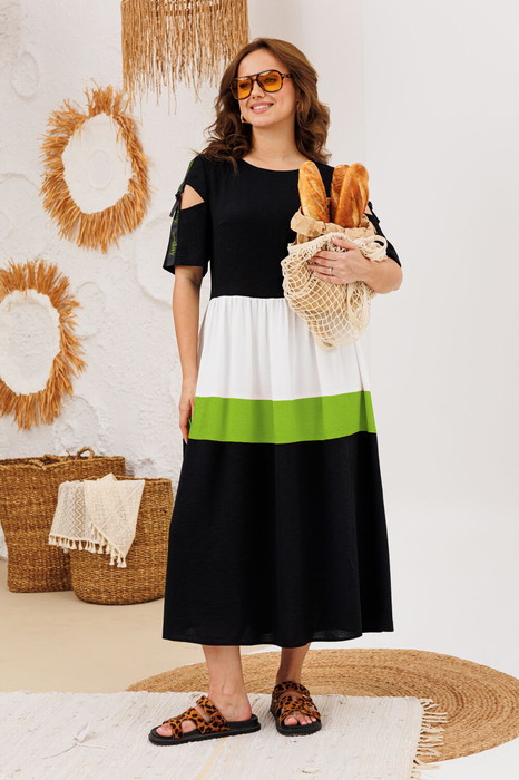 Платье свободного силуэта, вырез горловины округлый. Рукав втачной с декоративным элементом в виде прорези с тесьмой. В боковых швах карманы. Изделие без застежки и без подкладки.