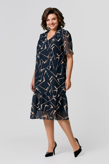 Женское нарядное платье A-силуэта из шифона на мягкой эластичной подкладке с антистатическим эффектом. По переду платья отрезные кокетки с небольшой сборкой,  V-образная  горловина с декоративными завязками, по низу - отрезной валан, придающий воздушность.  Длина 112 см, длина рукава 30-32 см.