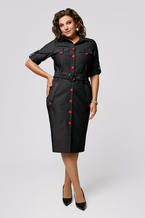 Платье женское полуприлегающего силуэта выполнено из высококачественного трикотажа. По переду изделия функциональные накладные и прорезные карманы, застежка на петли и пуговицы, рукава втачные. Карманы и рукава дополняют декоративные паты. В комплект входит съемный пояс с пряжкой из основной ткани.