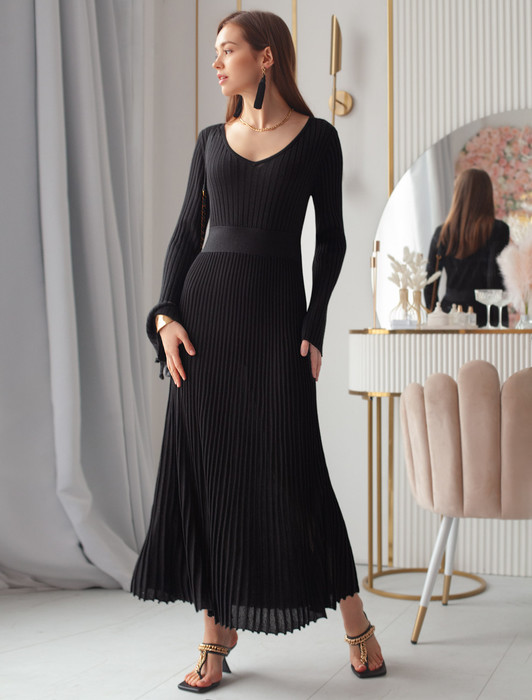 Состав: 72%Вис 28%Мет (люрекс) Параметры модели на первом фото: Рост 170, бюст 89, талия 63, бедра 92Платье А-силуэта выполнено из вискозы тонкой вязки с мягким люрексом. Модель с V- вырезом сидит по фигуре, подчеркивая женственные изгибы тела. Поперечная резинка на талии визуально делает талию уже, создавая эффект песочных часов. Юбка со складками в стиле "гофре" струится по бедрам. Изящный блеск пряжи позволяет носить изделие, как на торжественный выход, так и в повседневной жизни.