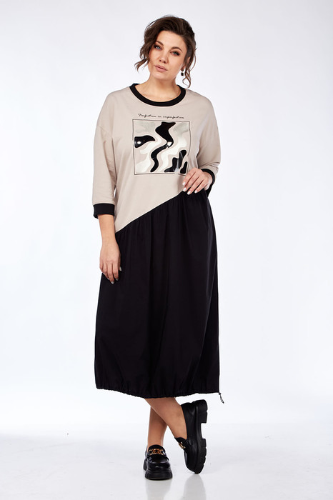 Платье женское свободного кроя, комбинированное из трикотажного полотна и хлопка. Платье с косой линией подреза со сборкой. Горловина круглой формы. На полочке — печать. В боковом шве обработан карман. Рукава спущенные, длинной 3/4 . По горловине и низу рукава — довяз. По низу платья кулиса, в которую втянут шнур — резинка с фиксатором, для регулировки объема внизу. Платье на подкладке от линии подреза.