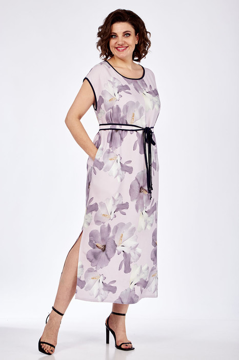 Платье женское прямого силуэта, изготовлено из плательной ткани. Горловина круглой формы, рукав спущенный с контрастной окантовкой. По переду нагрудные вытачки. В боковых швах обработаны карманы и разрезы внизу. Платье дополнено декоративным съемным поясом.