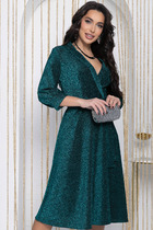 Платье женское, прямого силуэта, слегка зауженное к низу. Изготовлено из велюра и отделочной ткани с пайетками. Горловина фигурной формы.  По переду обработаны нагрудные вытачки. Платье отрезное по талии. По лифу платья, низу изделия и низу рукавов — отделочная ткань. По спинке средний шов и разрез внизу. Рукава втачные, длиной 3/4.