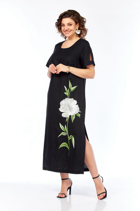 "Платье женское прямого силуэта, изготовлено из натуральной ткани. Горловина круглой формы. По переду обработаны нагрудные вытачки. На спинке средний шов. В боковых швах обработаны карманы, внизу разрезы. Рукава втачные, разрезные с фигурным вырезом. Платье декорировано дизайнерской вышивкой.