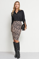 Платье женское из гладкокрашеного тканого полотна, свободное,слегка расширенное к низу, с горловиной овальной формы, короткими втачными рукавами, вытачками в области груди, карманами в боковых швах. Перед состоит из двух частей, в шве соединения деталей по центру разрез, горловина окантована основным материалом.