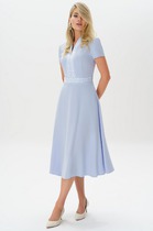 Платье женское из трикотажного полотна «кулика» с набивным рисунком, отрезное по линии талии, с короткими втачными рукавами, горловиной овальной формы и центральной бортовой застежкой по лифу на петли и пуговицы. Юбка – из двух ярусов, каждый из которых присборен по шву стачивания с верхней деталью. Горловина овальной формы окантована по спинке и обтачана по переду.