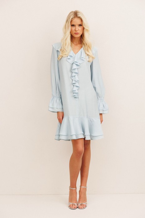 - струящиеся воланы по горловине, рукавам и низу