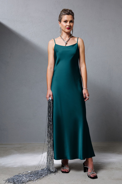 Платье сорочка прилегающего силуэта по груди и талии и с расширением к низу. Платье на бретелях, длина бретели регулируется. Платье выполнено из плотного струящегося атласа. Длина платья с бретелью - 136 см.