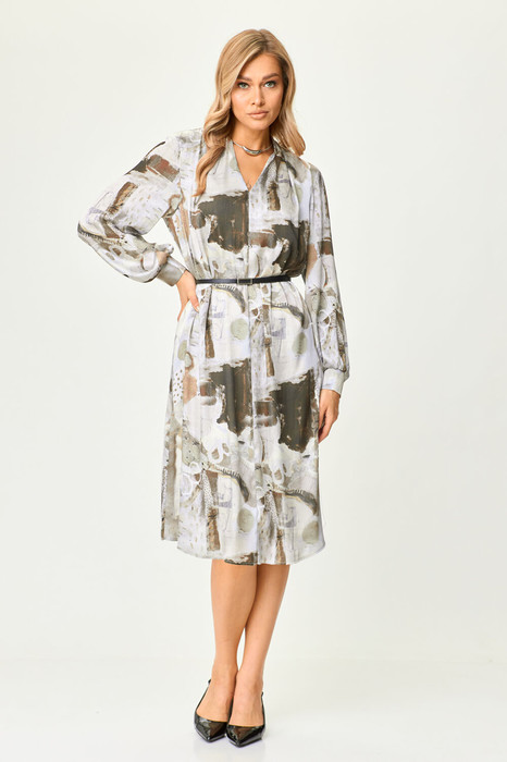 Струящееся шифоновое платье (в этой модели мы используем новое качество шифона с легким благородным блеском), длинной ниже колена, трапециевидного силуэта с V-образным вырезом горловины, переходящим в небольшую стойку по спинке. От плечевого шва у горловины – складка. Платье хорошо подходит на разные типы фигур, так как оно без нагрудным вытачек и без подрезов на талии, приталить платья легко за счет ремня, который идет в комплекте с платьем. Рукав платья втачной, с легкой сборкой у манжеты. Манжета застегивается на петли и пуговицы. По центру переда – шов. Все линии платья служат тому, что бы “вытягивать” фигуру придавая ей легкость и стройность. Платье отлично подойдет для различных мероприятий, как для праздников, так и для офисный будней. Платье на трикотажной подкладке.