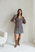 Платье женское из вискозной ткани, полуприлегающего силуэта,прямое книзу, длиной до середины икр, в боковых швах обработаны разрезы, со съемным поясом из декоративной тесьмы. Деталь переда платья с нагрудными вытачками. Вырез горловины – «V-образной» формы. Платье: длинасередины спинки – 130см.