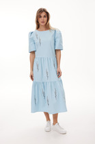 Вырез горловины округлой формы, застежка на потайную тесьму-молнию в среднем шве спинки. Деталь переда с нагрудными вытачками. Деталь спинки со средним швом и талиевыми вытачками. Рукава втачные из отделочной ткани, с вертикальным разрезом по центру. Рукава с притачными манжетами с застежкой на 1 петлю и пуговицу, по шву соединения обработана сборка.