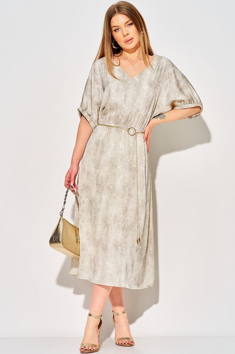 Длина платья до середины икр, отрезное на уровне линии талии, к низу расширенное. Вырез горловины платья «V-образной» формы, обработан обтачкой. Лиф детали переда со средним швом. Юбка платья на тонкой трикотажной подкладке. В шов соединения лифа и юбки вставлена эластичная тесьма. Рукава цельнокроеные, с ластовицей, и с притачной планкой, собраны на эластичную тесьму.