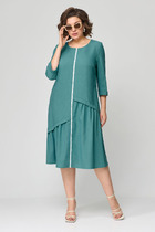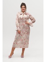 Воздушное элегантное платье нежного светло-бежевого оттенка с изящным цветочным принтом. Прекрасная посадка на фигуре. Изделие состоит из отрезного лифа, спереди со складками по линии груди, по спинке - сборка. Юбка изделия имеет расклешение к низу, по талии фрагментами сборка. Лиф и юбку соединяют облегающие рельефные детали, имитирующие фигурный корсет, высотой от 7.5-12 см. Спереди платье на застежке: петли/пуговицы. Горловина имеет V-образный вырез. Рукав втачной, одношовный, с притачной манжетой. Длина рукава в готовом виде 65,5 см. По окату и низу рукава-сборка. Спереди платье имеет застежку на петли-пуговицы. Длина платья по спинке 112-115 см. (согласно размерному ряду). Платье на трикотажной подкладке телесных оттенков (лиф платья и юбка.)