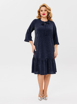 Платье лёгкое, струящееся на запахе. Отрезное по линии талии, расширенное к низу. Воротник выходящий из линии плеча, пиджачного типа, на участке воротника - декоративная перемычка создающая мягкую складку. Рукава одношевные с узкой резинкой по низу и сборкой по окату. Длина рукава до линии локтя. Застежка внешней части переда на потайную кнопку, внутренней части переда на завязку. В боковых швах карманы. Особенностью платья платья является обработка всех внутренних швов платья окантовкой, что придает изделию элитный вид.