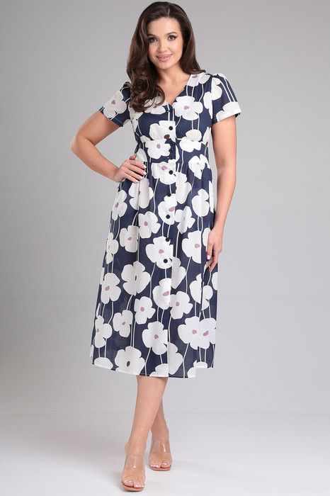 Платье женское, по линии талии отрезной фигурный пояс, нижняя часть платья со сборкой и в нижнюю часть платья вставлена хлопковая подкладка. По верхней части переда небольшая сборка из линии пояса. Спинка с узкой горизонтальной кокеткой. В верхней части спинки из линии кокетки и линии пояса спроектирована небольшая сборка. Вырез горловины "V- образной" формы. Рукав одношовный, короткий, втачной, со сборкой по окату. В боковых швах расположены функциональные карманы. Застежка на петли и пуговицы до низа изделия.