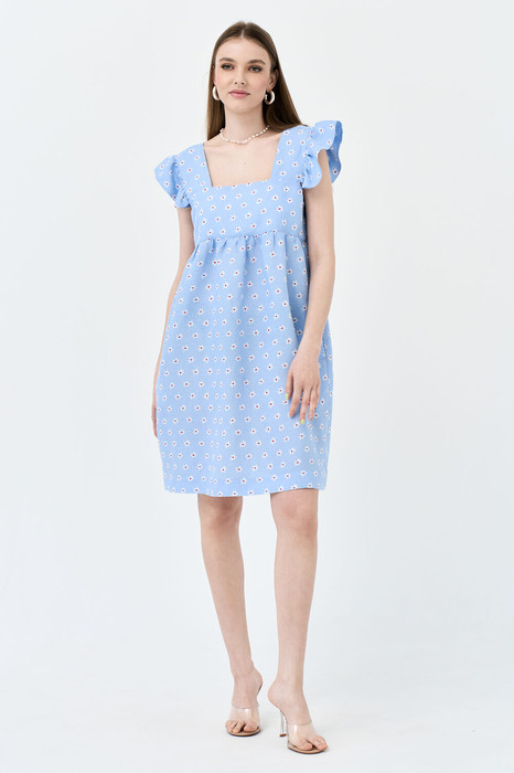 Сарафан А-силуэта. По переду и спинке горизонтальная кокетка, нижняя часть платья со сборкой. На широких бретелях, во внешний шов бретели вставлены воланы-крылышки со сборкой. В боковых швах карманы. Сарафан без подкладки в нижней части.