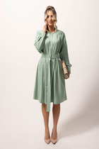 Платье с округлым вырезом горловины, отрезное по талии и съёмным поясом из ткани. Перед с кокеткой из сетки горохи флок и дизайнерским вырезом в верхней части. Нижняя часть переда со встречной складкой. Спинка с талиевыми вытачками и потайной молнией в среднем шве. Рукава втачные выполненные из сетки горохи флок. Изделие с карманами в боковых швах.