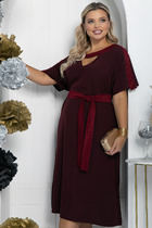 Платье с V – образным вырезом горловины, переходящим на стойку по спинке, и съёмным поясом из ткани по талии. Перед с фигурными деталями из контрастной ткани. Спинка со шлицей в среднем шве и талиевыми вытачками. Рукава втачные с трикотажным довязом по низу.