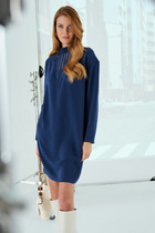 Платье с фигурным вырезом горловины по переду и стойкой по спинке. По талии съёмный пояс из основной ткани. Изделие со складками от кокетки по переду и спинке. Перед с декоративными пуговицами в верхней части и средним швом. Спинка с разрезом в среднем шве. Рукава втачные, со сборкой по окату и складкой с пуговицами в нижней части.