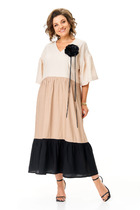Платье с округлым вырезом горловины,фигурным низом и отрезное по талии. Верхняя часть переда платья с декоративной тесьмой. Спинка с талиевыми вытачками и застёжкой на петлю с пуговицей в верхней части. Низ платья с наложением на основную ткань сетки. Рукава втачные с манжетами по низу. Платье с потайной молнией в боковом шве.