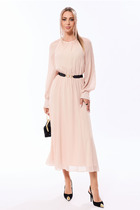 Платье из лёгкой ткани с ярким принтом. Застежка на потайную молнию по среднему шву спинки. В комплекте идет длинный съемный пояс. На юбке по линии талии заложены складки. Длина 128 см.