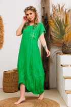 Платье свободного кроя из шифоновой ткани. Рукав втачной, до линии локтя по верхней части рукава сборка, по низу рукава резинка. По горловине воротник рубашечного типа на завязку и фигурный вырез в форме капли. Платье по линии талии отрезное, на резинке. По юбке платья притачной волан на сборку. В комплектацию входит пояс из экокожи и съёмный бант, который также можно завязать на талии как пояс.
