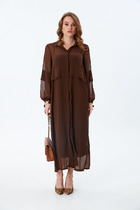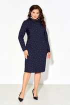 Платье полуприлегающего силуэта, выполнено из костюмной ткани. Рукав втачной длинный, выполнен из хлопка. По верхней и нижней части рукава сборка, по низу рукава манжета на застежку на петли и пуговицы. По горловине воротник рубашечного кроя. По левой стороне складка имитирующая запах. Выше линии груди пришиты металлические пуговицы. По спинке средний шов переходящий в застежку на потайную молнию.