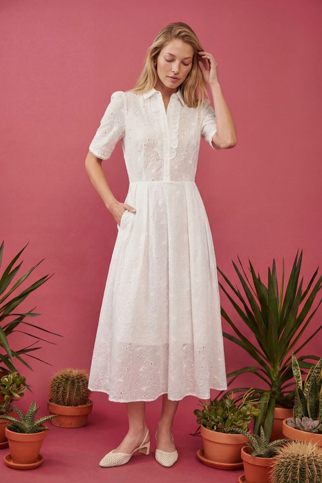 Платье полуприлегающего силуэта из хлопковой ткани ришелье с подкладкой из хлопка по юбке. Воротник рубашечного кроя, по переду планка с рюшей, застёжка на петли и пуговицы, в области плеча многоцветная вышивка. Рукав втачной, короткий. По верхней части рукава сборка. Платье отрезное по линии талии. По юбке глубокие складки, в боковых швах прорезные карманы. По спинке в горизонтальный шов вставлена тонкая резинка, что очень удобно в носке. В комплектацию входит съёмный пояс из экокожи.