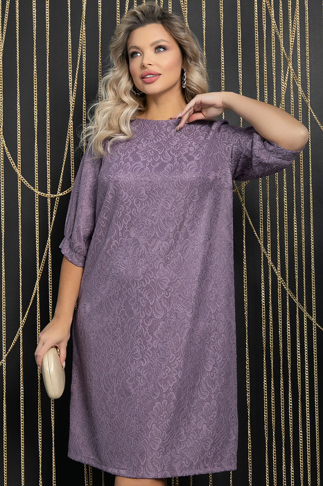 Очаровательное платье в сиреневом оттенке. Оно прямого силуэта, рукав 3/4 с манжетом. Вырез округлый, сзади на пуговице. Выполнено с нежным кружевом на трикотаже и легким блеском, идеально для торжеств и других мероприятий. Станет вашей визитной карточкой, подчеркивая вашу красоту и уверенность в себе. По бокам разрезы.