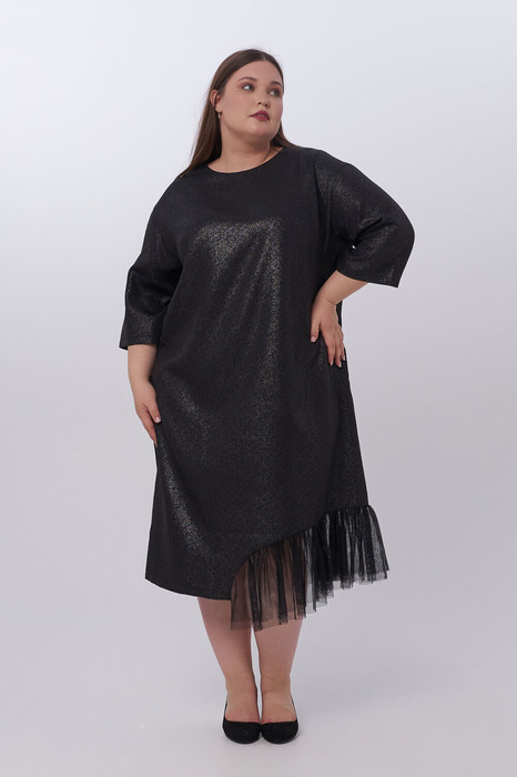 Эффектное платье прямого силуэта из ткани с метталическим напылением, которая добавляет изделию особую легкость. Горловина круглая, обтачная, без воротника, застежка на петлю-пуговицу. Рукав длинной 3/4 на спущенной линии плеча. Прилегание по груди за счет вытачек. Изюминкой модели является фигурный подрез по низу слева, со вставкой из трикотажной двойной сетки. В боковых швах удобные карманы. Низ разноуровневый за счет вставки из сетки. В этой модели Вы точно не останетесь не замеченной!