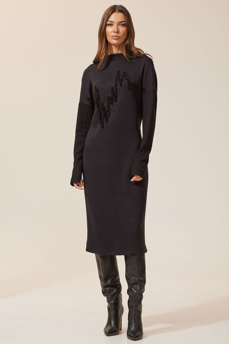 Платье полуприлегающего силуэта из трикотажного полотна. Горловина с цельнокроеной стойкой. Рукав со спущенной линией плеча комбинированный отделочной тканью.  По переду дизайнерская вышивка.