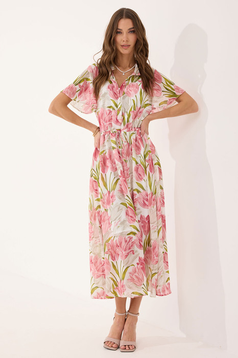 Платье полуприлегающего силуэта расширенное книзу из шифоновой ткани. Горловина-стойка, по переду застежка на петли и пуговицы. Рукав втачной расширенный.  По переду и спинке в районе талии подрез с кулисой и завязками для регулирования степени прилегания. В комплект входит нижнее платье