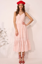 Платье на бретелях полуприлегающего силуэта из ришелье. По переду и спинке притачной пояс. На лифе переда нагрудные вытачки, на спинке – талиевые. Нижняя часть платья со сборкой по линии притачивания с поясом. В боковом шве потайная молния.