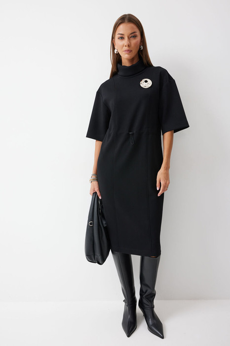 Платье прямого силуэта из трикотажного полотна. Горловина-стойка. Рукав со спущенной линией плеча, с коротким рукавом. На спинке в центральном шве по низу разрез. По переду и спинке декоративные рельефы. В районе талии кулиса с фиксатором для регулирования степени прилегания. В комплект входит съемная брошь. Обращаем ваше внимание, что фурнитура может отличаться от фото.