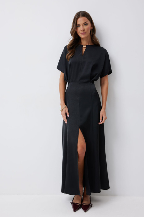 Нарядное платье из струящейся ткани длины макси. Рукав цельнокроеный. Платье отрезное по линии талии, на полочке заложены складки. Горловина округлая, с декоративно протяжкой по центру. По спинке средний шов с застежкой на потайную молнию. Юбка расширенна книзу от бедра. Обращаем ваше внимание, что фурнитура может незначительно отличаться от фото.