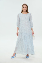 Элегантное платье полуприлегающего силуэта, с отрезной талией, на подкладке. Рукав втачной, по низу присборен на эластичную тесьму.  Застежка по боковому шву на потайную молнию, а так же по спинке на пуговицу.  Вырез горловины V-образный. Спереди платья имитация центральной застежки с пришивными пуговицами.   Длина платья от плечевого шва 127см. Длина рукава 50см.