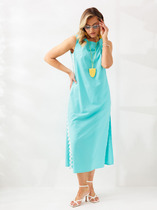 Платье женское отрезное по линии талии, расширенное книзу по центральной застежке на петли и пуговицы. Перед с нагрудными вытачками и вышивкой с левой стороны в области груди. В боковых швах - карманы. Спинка со средним швом по нижней части. Горловина округлой формы, слегка углублена. Рукав втачной одношовный, короткий с отложной манжетой по низу. Платье в комплекте с декоративным ремнём.