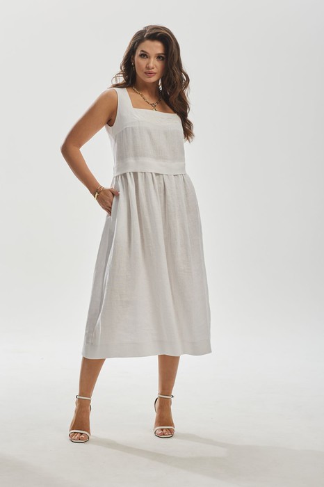Платье отрезное по талии, расширенное к низу. Юбка присборенная, карманы в боковых швах. Горловина – каре с вышивкой. Без рукавов.