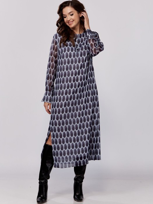 Платье прямого силуэта с длинным втачным рукавом на манжете. Горловина округлой формы с планкой и застежкой на пуговицы. Во бокам снизу шлицы. В комплекте пояс из основной ткани. Платье на подкладке.