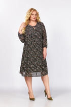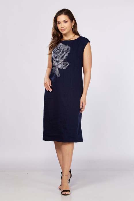 Платье полуприлегающего силуэта, слегка расширенное к низу. Спинка со средним швом. По переду нагрудные вытачки и декоративная вышивка  контрастной нитью. Горловина округлой формы. Плечо спущенное.В боковых швах карманы.