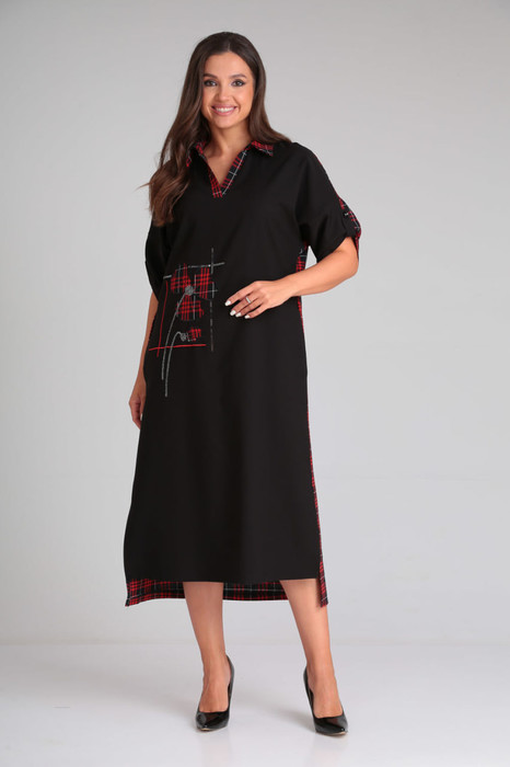 Универсальное платье в стиле «casual». Изделие выполнено из двух скомпонованных материалов — однотона и клетки. Перед и спинка цельнокроеные, спинка длиннее переда. Горловина с рубашечным воротником и V-образным вырезом. Плечо спущенное, рукав втачной длиной 3/4, застегивающийся на пату и пуговицу. По верху спинки имеется стачная встречная складка, благодаря которой имеется небольшое клешение. По переду платье украшено вышивкой из пайеток. В боковых швах имеются карманы, а также боковые разрезы. Изделие может сочетаться как с кедами, лоферами, так и туфлями. Универсальность и практичность платья сделают его любимым в Вашем гардеробе в наступающем осеннем сезоне. Длина по спинке 123 см, длина рукава 49 см. Изделие подойдет на рост 170 см.