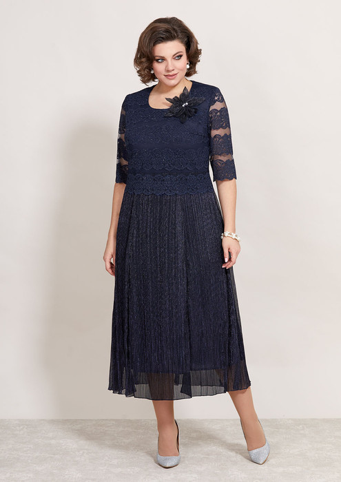Нарядное, отрезное по линии талии платье с отлетным кружевным лифом (имитация комплекта, лиф платья соединен с юбкой атласной подкладкой) и юбкой из легкой гофрированной ткани с люрексом, расширяющейся к низу  (все ткани тянутся).  Втачной короткий рукав выполнен, как и лиф платья,  из кружева с напылением. Юбка платья с рельефами. Потайная застежка-молния  в боковом шве платья.  Лиф платья украшает брошь ручной работы. Великолепное  платье, в котором  Вы будете блистать на любом торжественном мероприятии!
