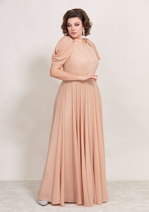Эффектное женское платье прилегающего силуэта в области талии, выполнено из шифона. Лиф платья отрезной по линии талии, выполнен в стиле корсета. Лиф проклеен дублирином и поставлен на подкладку, также дублированную, что создает плотный лиф и хорошо прилегая к телу, скрывает недостатки фигуры, утягивая ее. Лиф платья имеет несколько рельефов, которые декорированы кантом со стразами. Юбка платья имеет расклешенный силуэт, спинка идентична полочке, со средним швом, в боковом шве потайная молния. Также на платье обработан рукав расклешенного силуэта, из основной ткани. Эффектное, роскошное платье для обладательниц роскошных форм!