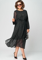 Элегантное женское платье полу-прилегающего силуэта, выполнено из трикотажного полотна, велюра и шифона. Горловина платья V-образная, обтачена подкладкой, по линии талии отрезное с вставкой из велюра по одной стороне и декорирована стразами. На лифе выполнена отлетная деталь из шифона по одной стороне, которая плавно переходит в отлетной шлейф на юбке. Спинка платья выполнена из однотонного велюра, со средним швом и вытачками, полочка на трикотажной подкладке. Рукав втачной, длинный, выполнен из шифона, расклишается к низу. Низ рукава декорирован кантом и притачной манжетой из шифона, с застежкой на петлю-пуговицу. Эффектное платье с необычным декором сделает ваш образ самым ярким на любом мероприятии!